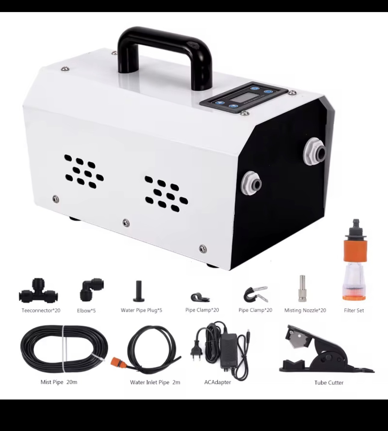 filter set, and a tube cutter for easy customization. The misting machine features dual water outlet ports, strong airflow ventilation, anti-corrosion components, and stable pressure regulation for smooth mist distribution. Additionally, its integrated filtration system ensures clean mist output while protecting the pump from impurities.