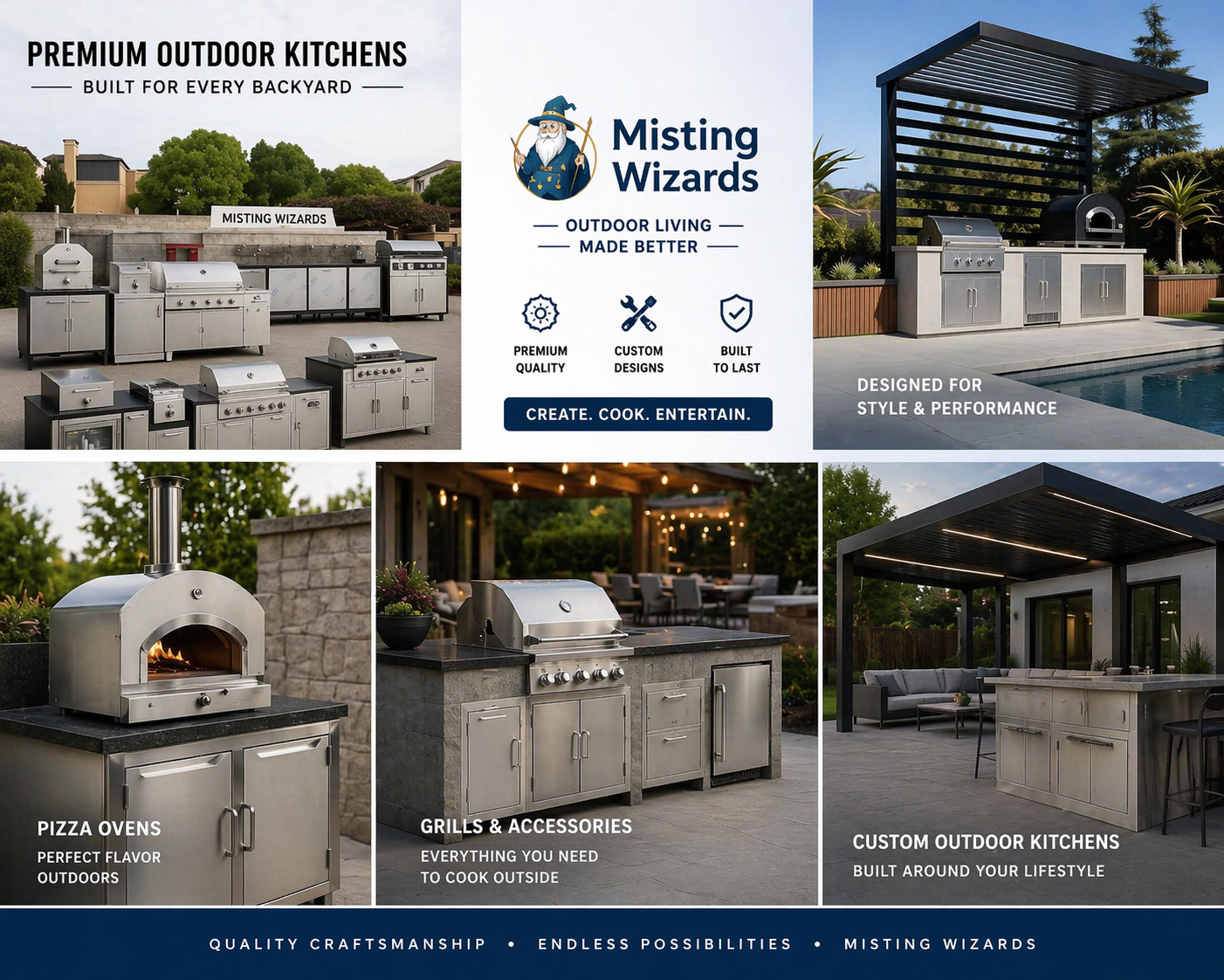 At Misting Wizards, we offer outdoor solutions designed to match your style preferences and outdoor living goals. Our goal is to help customers create beautiful, functional backyard spaces with custom outdoor kitchen options that reflect quality, convenience, and modern design.