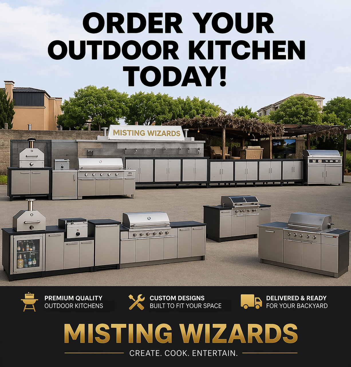If you are looking for a stylish and functional outdoor kitchen, Misting Wizards offers custom solutions designed for backyard cooking, entertaining, and outdoor enjoyment. Upgrade your outdoor space with an Luxury Backyard Kitchen that combines design, usability, and a premium outdoor living experience.