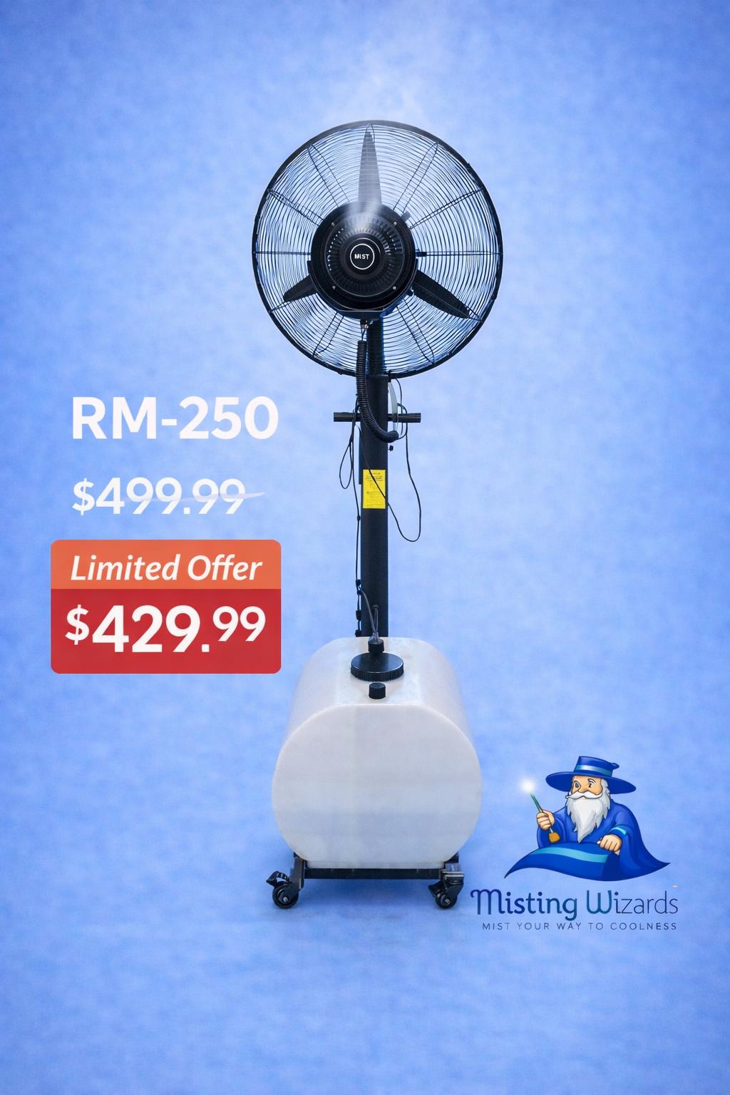 The RM-250 Misting Fan is a high-performance industrial misting fan designed to provide reliable airflow and cooling support for warehouses, large indoor spaces, and demanding environments. Built with a durable design and portable functionality, the RM-250 Misting Fan is ideal for customers who need consistent air movement combined with misting capability.